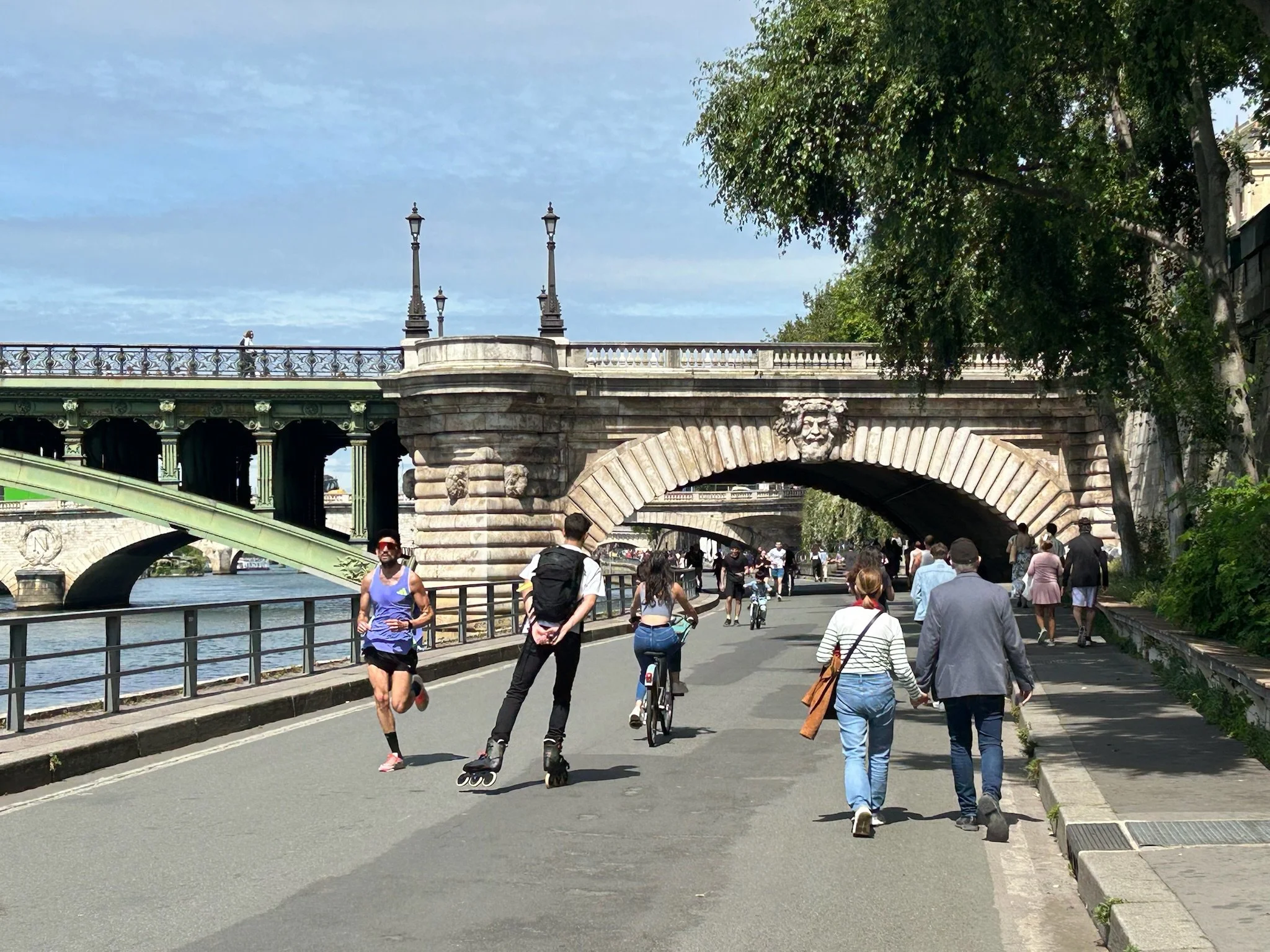 Paris went with a big mix of infrastructure to get its system going fast. Bi-directional bike/scooter lanes, center-running bikeways, concrete-protected lanes, parking-buffered lanes, and off-road paths are scattered throughout the city. City officials are finding that some of these options work better than others, which gives us the opportunity to learn from their trials and forgo their errors.